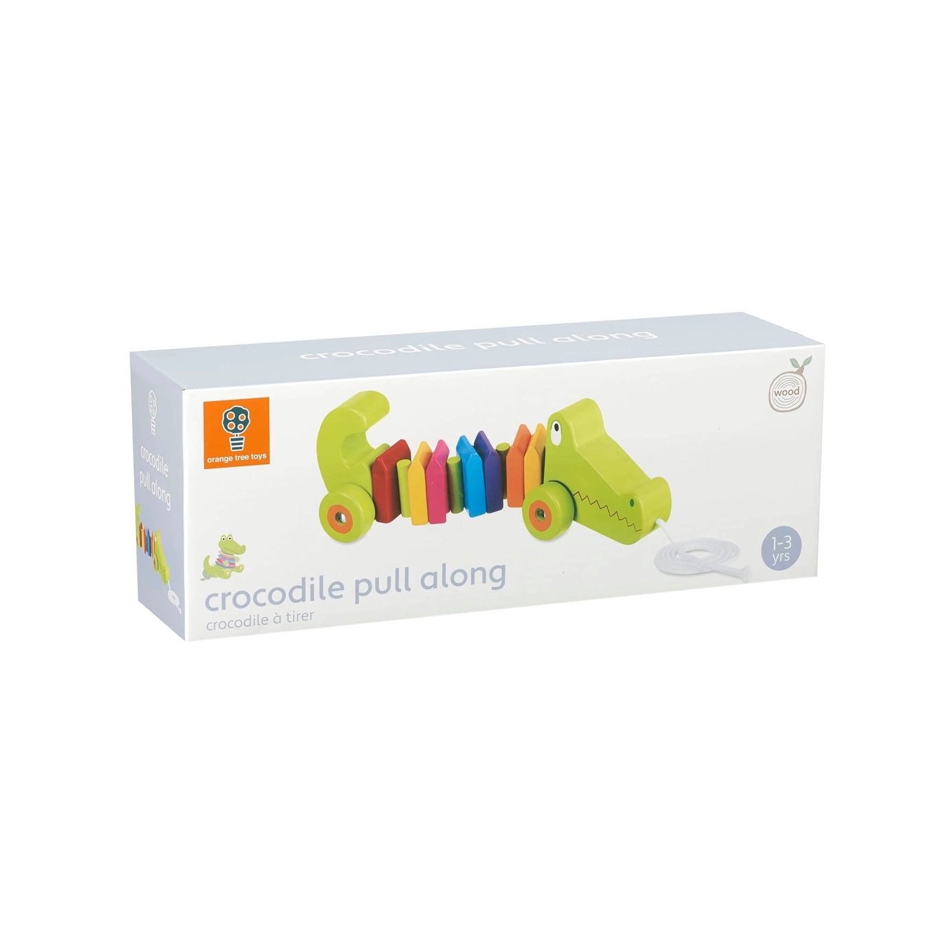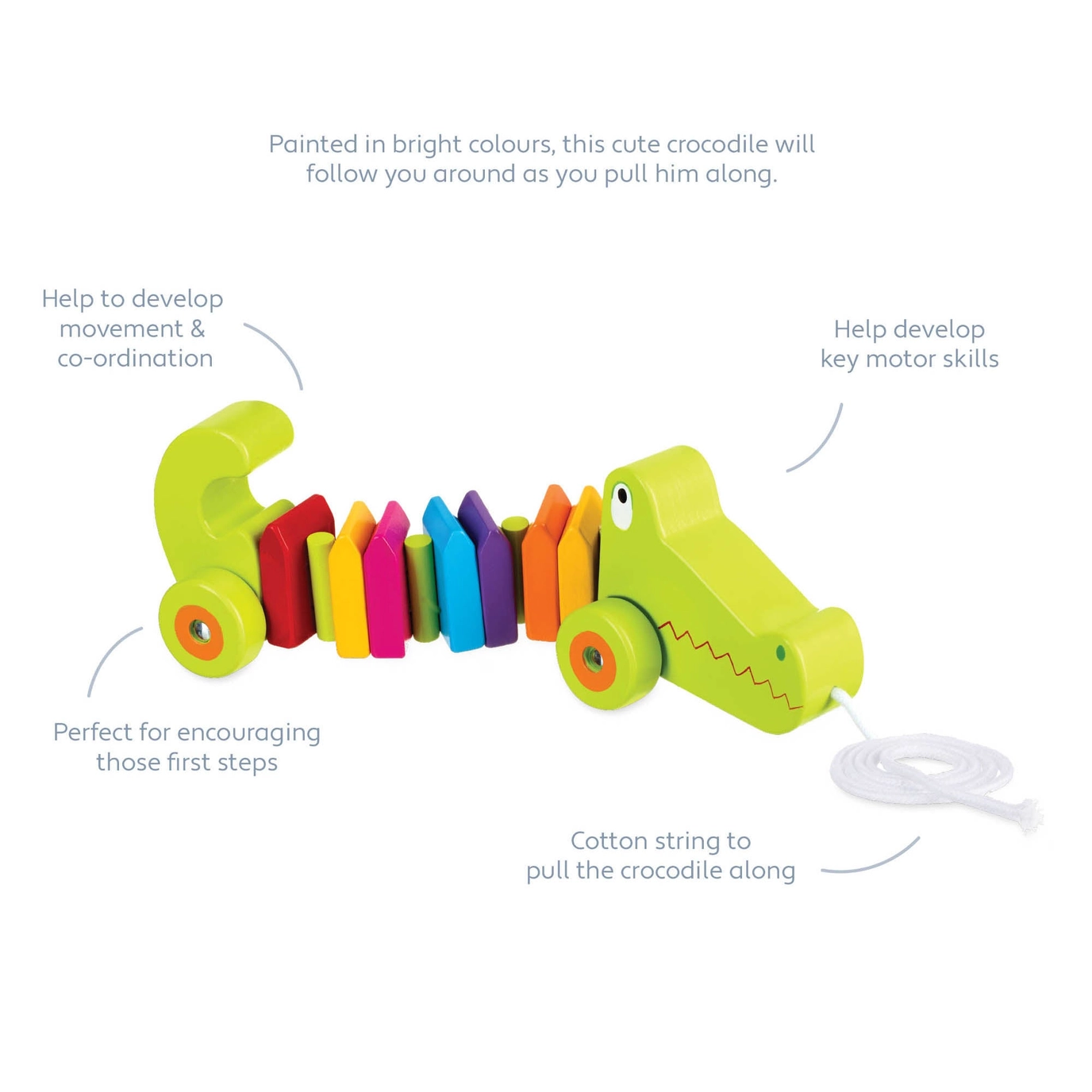 Make friends with this beautiful wooden pull along Crocodile. Painted in bright colours, this cute crocodile will follow you around as you pull him along. Perfect to encourage those first steps. Dimensions: 24 x 6.5 x 8 cm (9.4 x 2.6 x 3.1 in)