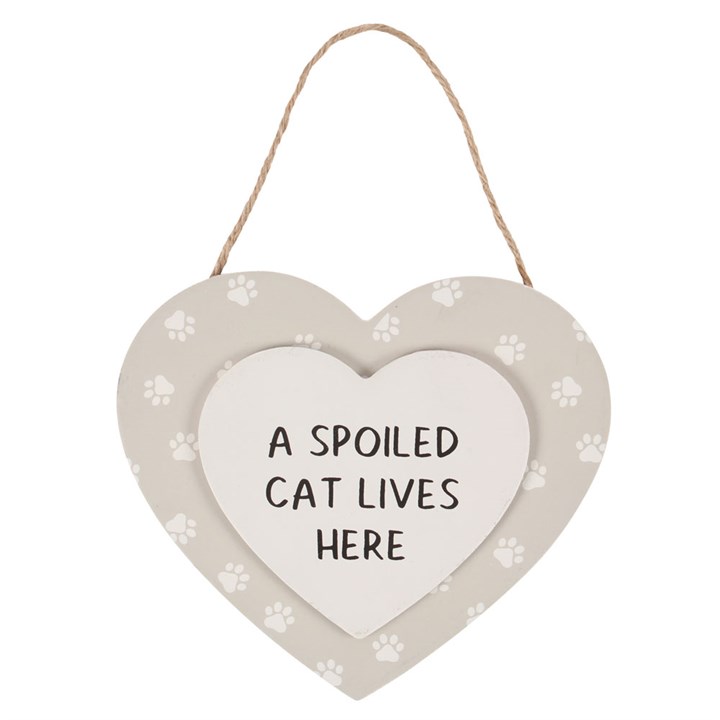 Heart-shaped hanging sign with a paw print design featuring the words ‘A Spoiled Cat Lives Here’. Product Dimensions: H12.5cm x W14cm x D1cm Packaged Dimensions: H12.5cm x W14cm x D1cm