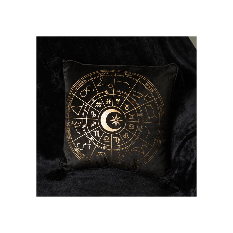 Add a touch of celestial elegance to the home with this Astrology Wheel square cushion. This black cushion features a metallic gold finish adorned with black tassels for a stylish and cosy addition to any room. This 35m square cushion is made from 100% polyester and is suitable for dry clean only. Dye may transfer.