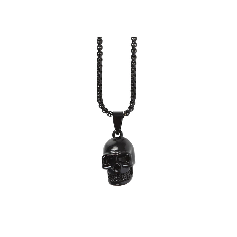 Blending gothic charm and modern style this black stainless steel skull pendant necklace is a striking accesory. Perfect for those who love to make a statement the necklace design combines the edgy appeal of the skulls with the sleekness of black stainless steel. Jewellery is nickel free.