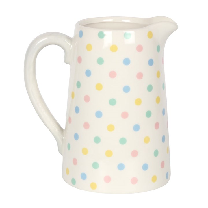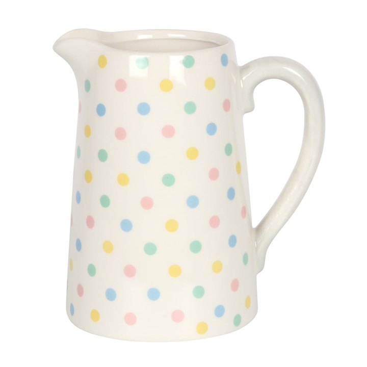 Brighten up your home decor this spring season with this polka dot ceramic flower jug. Place on your dining table, windowsill or hallway console table to instantly freshen up your home. Product Dimensions: H17.5cm x W17.5cm x D11.7cm Packaged Dimensions: H18.5cm x W18.5cm x D12.5cm