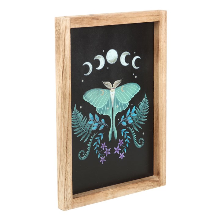 Add a touch of enchantment and mystery to your space with this framed Luna Moth print. This captivating, statement print features an intricate luna moth design including a moon phases, flowers and stars, elegantly framed in wood to compliment any décor.